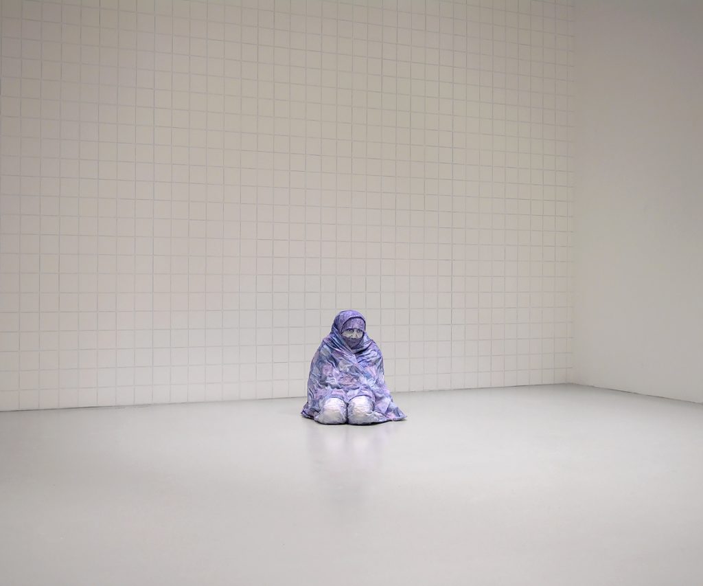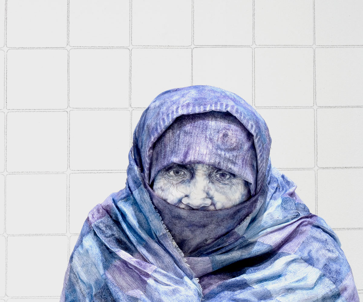 Being Staring at Something, 2004, colored pencil on acrylic on papier-mâché, background: blue pencil on wall